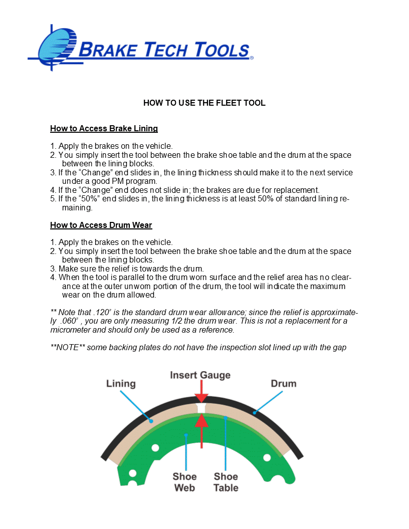 Note: This tool is intended for quick assessments only and does not provide exact brake lining measurements. Perfect for sales professionals or technicians who need a fast, reliable way to gauge brake wear.